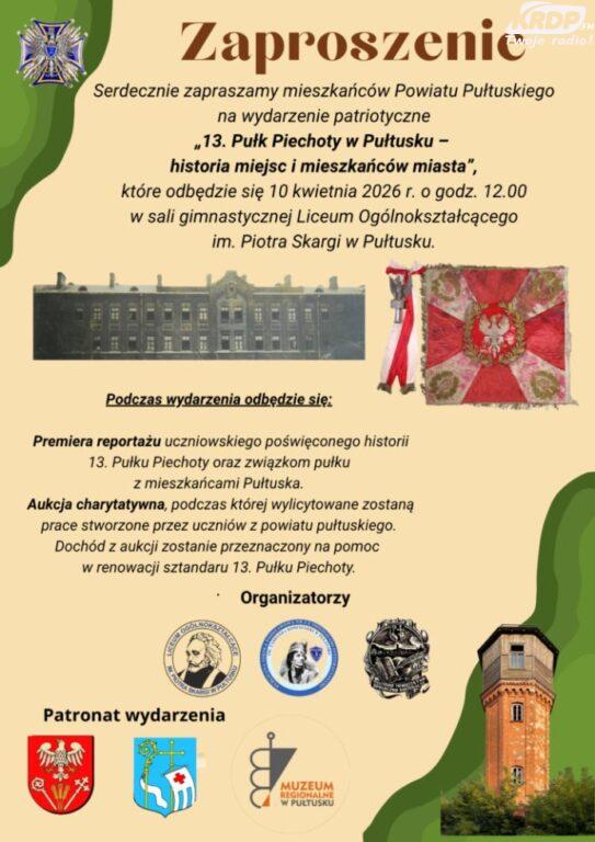 Liceum Ogólnokształcące im. Piotra Skargi w Pułtusku, Publiczna Szkoła Podstawowa Nr 3 z Oddziałami Integracyjnymi im. Tadeusza Kościuszki oraz Pułtuskie Towarzystwo Społeczno-Kulturalne zapraszają mieszkańców Powiatu Pułtuskiego na wydarzenie patriotyczne „13. Pułk Piechoty w Pułtusku – historia miejsc i mieszkańców miasta”, które odbędzie się 10 kwietnia o godz. 12.00 w sali gimnastycznej Liceum Ogólnokształcącego im. Piotra Skargi w Pułtusku. Podczas wydarzenia odbędzie się premiera reportażu uczniowskiego poświęconego historii 13. Pułku Piechoty oraz związkom pułku z mieszkańcami Pułtuska. Odbędzie się także aukcja charytatywna z licytacją prac stworzonych przez uczniów z powiatu pułtuskiego. Dochód z aukcji zostanie przeznaczony na renowację sztandaru 13. Pułku Piechoty. Zapraszamy w imieniu organizatorów.