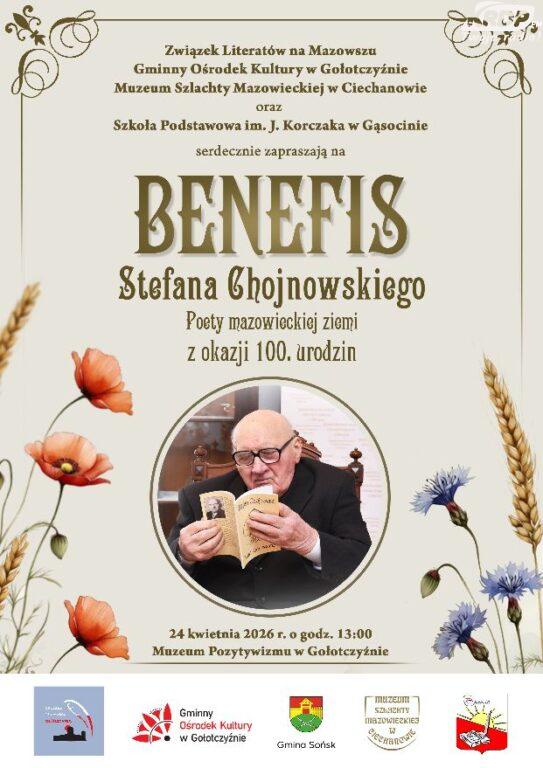 Związek Literatów na Mazowszu, Gminny Ośrodek Kultury w Gołotczyźnie, Muzeum Szlachty Mazowieckiej w Ciechanowie oraz Szkoła Podstawowa im. Janusza Korczaka w Gąsocinie serdecznie zapraszają na uroczysty Benefis wybitnego mazowieckiego poety ludowego, rolnika i działacza społecznego – Stefana Chojnowskiego, który 24 kwietnia 2026 roku kończy 100 lat.