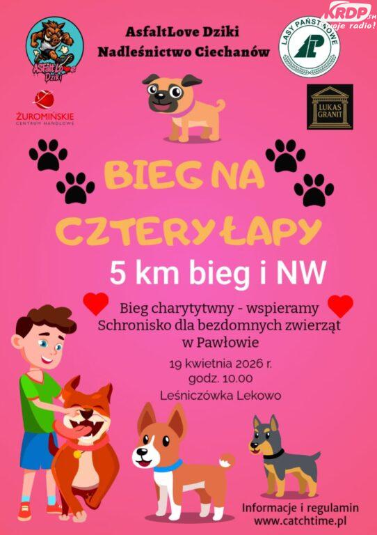 Stowarzyszenie Asfaltlove Dziki wraz z Nadleśnictwem Ciechanów zapraszają 19 kwietnia o godz. 10.00 do Leśniczówki w Lekowie na „Bieg na cztery łapy”. Wydarzenie ma charakter charytatywny. Wsparcie otrzyma Schronisko dla bezdomnych zwierząt w Pawłowie. O szczegółach wydarzenia mówi Agnieszka Kościelska, członkini stowarzyszenia Asfaltlove Dziki.