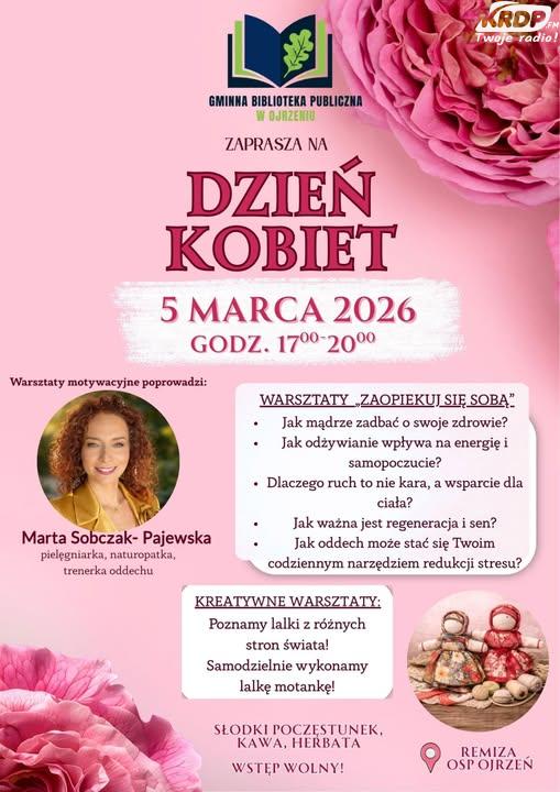 Z okazji Dnia Kobiet władze samorządowe Gminy Ojrzeń zapraszają wszystkie Panie na inspirujące spotkanie pełne rozmów, kreatywności i dobrej atmosfery. Odbędzie się 5 marca 2026 r., od godz. 17.00 do 20.00 w Remizie OSP w Ojrzeniu. Jest to wydarzenie otwarte, a udział jest bezpłatny.