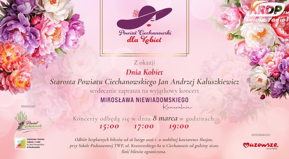 Starosta Powiatu Ciechanowskiego Jan Andrzej Kaluszkiewicz zaprasza 8 marca do hali sportowej Miejskiego Ośrodka Sportu i Rekreacji przy ulicy Kraszewskiego 8 w Ciechanowie na koncert z okazji Dnia Kobiet. O wydarzeniu mówi Jan Andrzej Kaluszkiewicz.