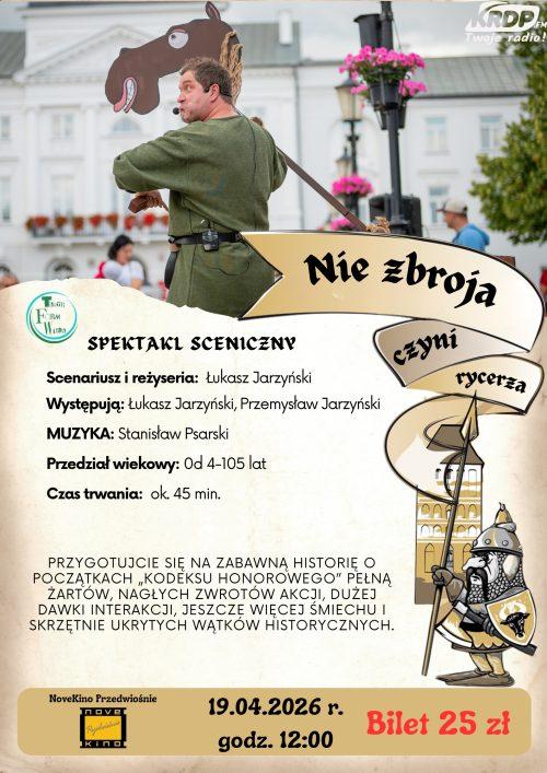 Spektakl “Nie zbroja czyni rycerza” zostanie wystawiony 19 kwietnia o godzinie 12:00. Szczegóły na temat wydarzenia i biletów znajdziemy na stronie NovegoKina Przedwiośnie w Płocku.