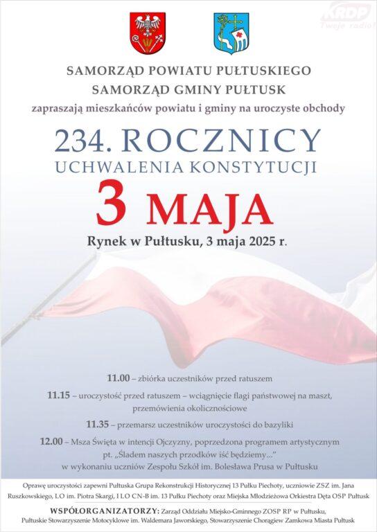 Samorząd Powiatu Pułtuskiego i Samorząd Gminy Pułtusk zapraszają mieszkańców powiatu i gminy na uroczyste obchody 234. Rocznicy Uchwalenia Konstytucji 3 Maja do Rynku w Pułtusku.Uroczystości rozpoczną się zbiórką przed ratuszem o godz. 11.00. O godz. 11.15 będzie miało miejsce wciągnięcie flagi pańsatwowej na maszt oraz przemówienia okolicznościowe. O godz. 11.35 uczestnicy uroczystości przemaszeruja do bazyliki. O godz. 12..00 rozpocznie się Msza Święta w intencji Ojczyzny, poprzedzona programem artystycznym pt. ,,Śladem naszych przodków iść będziemy…” w wykonaniu Zespołu Szkół im. Bolesława Prusa w Pułtusku. Oprawę uroczystości zapewni Pułtuska grupa Rekonstrukcji Historycznej 13 Pułku Piechoty, uczniowei ZSZ im. Jana Ruszkowskiego, Lizeum Ogólnokształcące Piotra Skargi , I LO CN-B im. 13 Pułku Piechoty oraz Miejska Orkiestra Dęta OSP Pułtusk. Zapraszamy w imieniu organizatora.