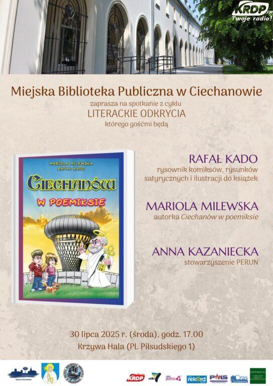 Miejska Biblioteka Publiczna w Ciechanowie zaprasza 30 lipca o godz. 17.00 do Krzywej Hali przy Placu Piłsudskiego 1 na spotkanie z cyklu Literackie Odkrycia, którego gośćmi będą Rafał Kado- rysownik komiksów, rysunków satyrycznych i ilustracji do książek, Mariola Milewska- autorka ,,Ciechanów w poemiksie” oraz Anna Kazaniecka- członek stowarzyszenia PERUN. Spotkaniu towarzyszyć będzie promocja komiksu “Ciechanów w poemiksie”, który wydany został przy wsparciu finansowym Urzędu Miasta. Zapraszamy w imieniu organizatorów. Wstęp na wydarzenie jest wolny.