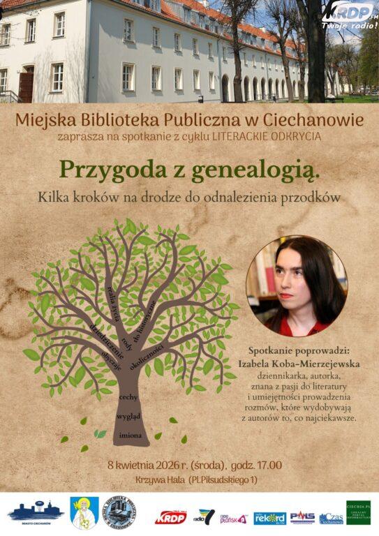 Miejska Biblioteka Publiczna w Ciechanowie zaprasza 8 kwietnia o godz. 17.00 do Krzywej Hali przy Placu Piłsudskiego 1 na spotkanie z cyklu Literackie Odkrycia pt. “Przygoda z genealogią. Kilka kroków do odnalezienia przodków”. Spotkanie poprowadzi Izabela Koba Mierzejewska, dziennikarka, autorka znana z pasji do literatury. W programie przewidziano: poznawanie podstaw badań nad historią własnej rodziny, wymianę doświadczeń oraz inspiracji związanych z genealogią i poszukiwaniami własnych przodków. Wydarzenie jest skierowane do wszystkich zainteresowanych tematyka genealogii. Zapraszamy w imieniu organizatora. Wstęp na wydarzenie jest wolny.