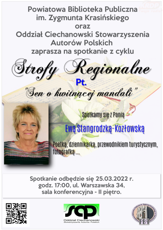 Strofy Regionalne pt: “Sen o kwitnącej mandali” to tytuł spotkania z poetką, dziennikarką i przewodnikiem turystycznym Ewą Stangrodzką -Kozłowską, które odbędzie się dzisiaj (w piątek 25 marca) w Powiatowej Bibliotece Publicznej w Ciechanowie.