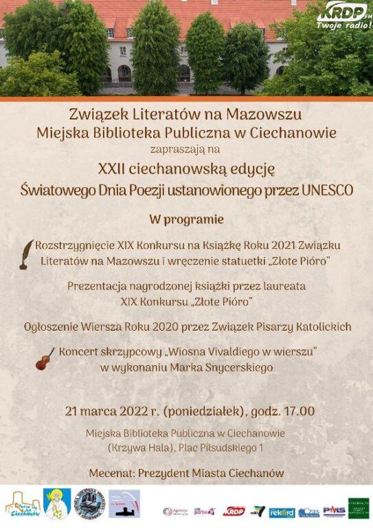 Już 21 marca br. w Ciechanowie, obchodzony będzie Światowy Dzień Poezji pod patronatem UNESCO. Jakie tradycje ma to święto poezji na ziemi ciechanowskiej – w audycji “Gość Poranka” mówiła dr Teresa Kaczorowska prezes Związku Literatów na Mazowszu.