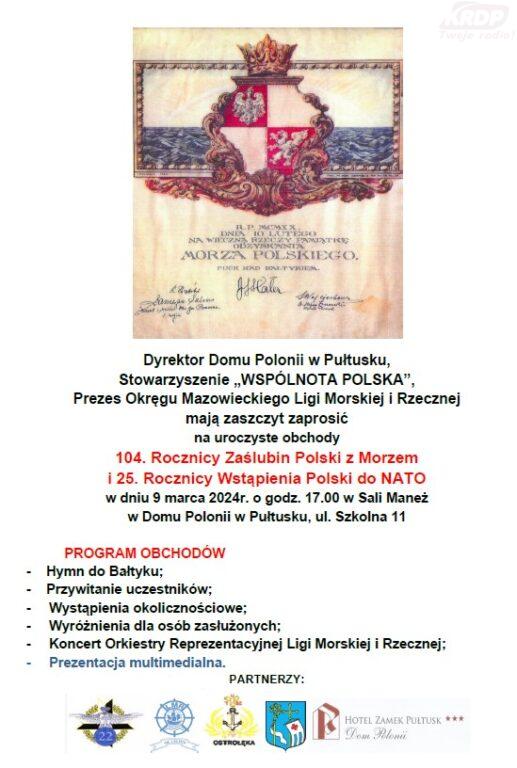 Dyrektor Domu Polini w Pułtusku,Stowarzyszenie “WSPÓLNOTA POLSKA” i Prezes Okręgu Mazowieckiego Ligi Morskiej i Rzecznej mają zaszczyt zaprosić na uroczyste obchody 104. Rocznicy Zaślubin Polski z Morzem i 25. Rocznicę Wstąpienia Polski do NATO. Uroczystości odbędą się 9 marca 2024 r. (sobota) o godz. 17.00 w Sali Maneż w Domu Polonii w Pułtusku przy ulicy Szkolnej 11. W programie obchodów jest: hymn do Bałtyku, przywitanie uczestników, wystąpienia okolicznościowe, wyróżnienia dla zasłużonych osób. Odbędzie się także koncert Orkiestry Reprezentacyjnej Ligi Morskiej i Rzecznej. Zaprezentowana zostanie także prezentacja multimedialna. Zapraszamy w imieniu organizatorów. Wstęp na wydarzenie jest wolny.