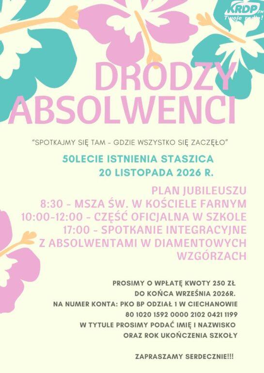 W Zespole Szkół nr 3 im. Stanisława Staszica w Ciechanowie 20 listopada 2026 roku odbędzie się Zjazd Absolwentów z okazji Jubileuszu 50-lecia istnienia szkoły Na spotkanie po latach zaprasza Marzena Chodkowska, dyrektor szkoły.